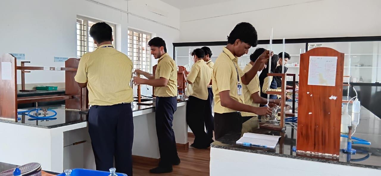 Chemistry :- Chemistry lab measuring 800 sqft with separate store room for chemicals & apparatus. Centralized gas connection. One integrated table for 4 students. Can accommodate 40 students at a time.